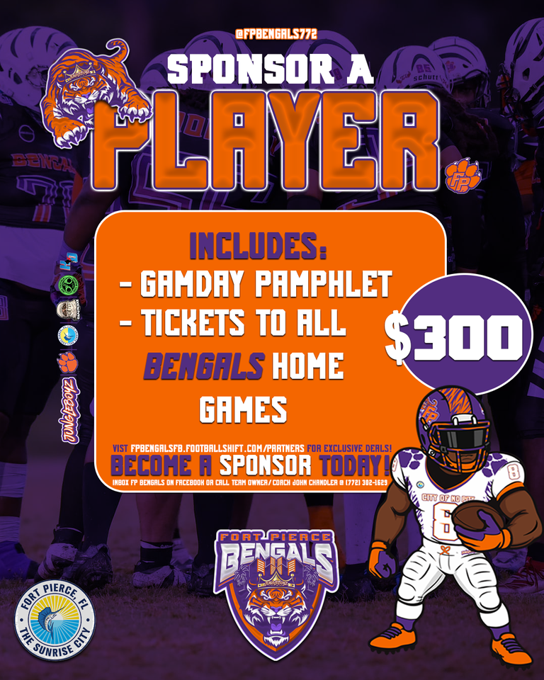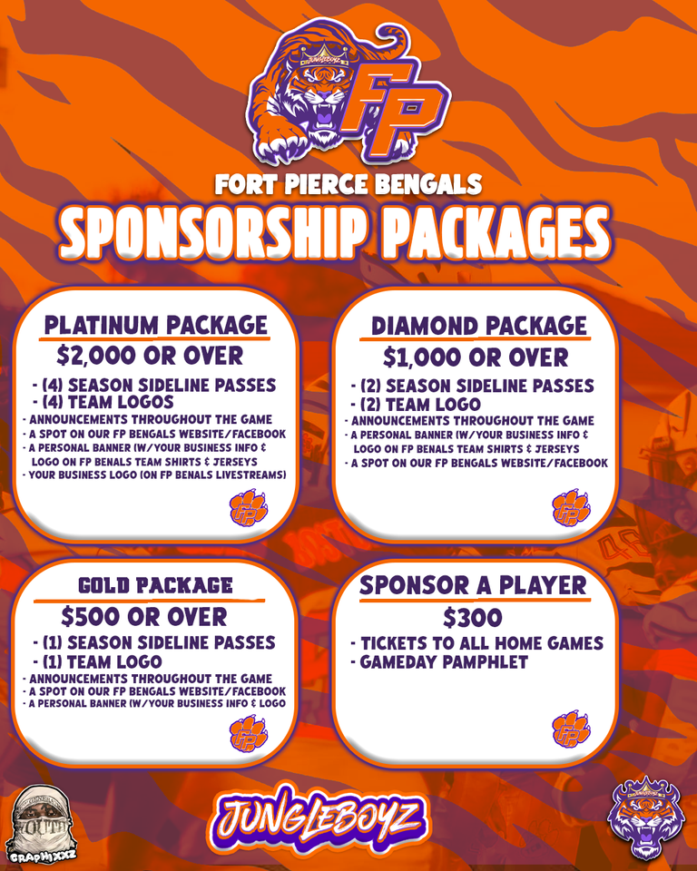 Any business’s looking for advertising and want to become a sponsor of your FP Bengals for the upcoming season?? We are trying to raise money to finish paying for our uniforms and games!!! We have different levels of sponsorship available from sponsoring a player to being our official uniform sponsor which will get you business logo on our game jersey’s, So if Local business that are looking for some cheap advertising and engagement with the community hit us up and we can show you all we offer with our sponsorship packages including your business name on our jerseys to your business name on our LIVE broadcast of our games. Join the BENGALS NATION and support your local team!!! Inbox FP Bengals on Facebook or call Team Owner/ Coach John Chandler @ (772) 302-1629